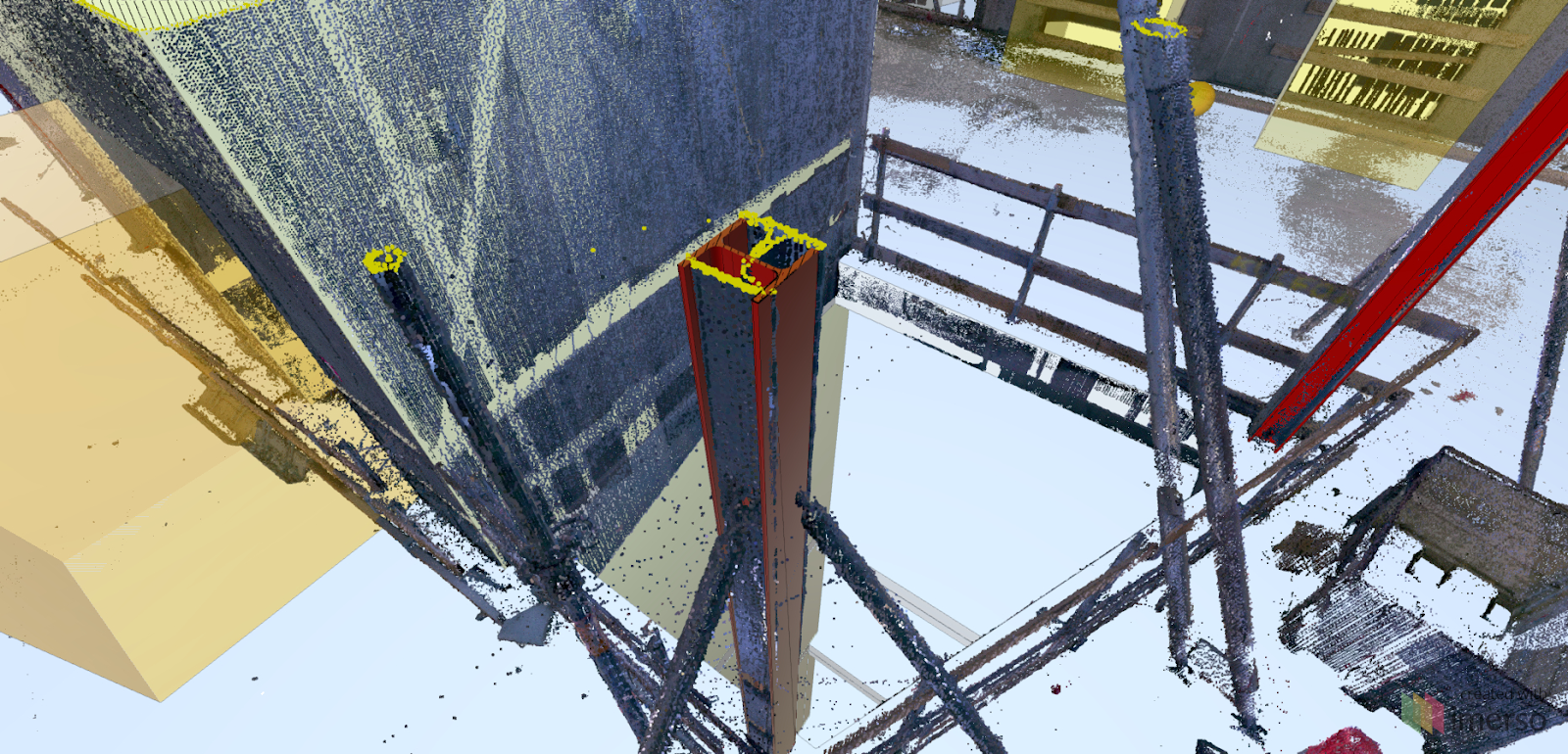 Abweichungsanalyse mit Imerso: Stahlträger vor Ort mit einer 90º-Drehung installiert.